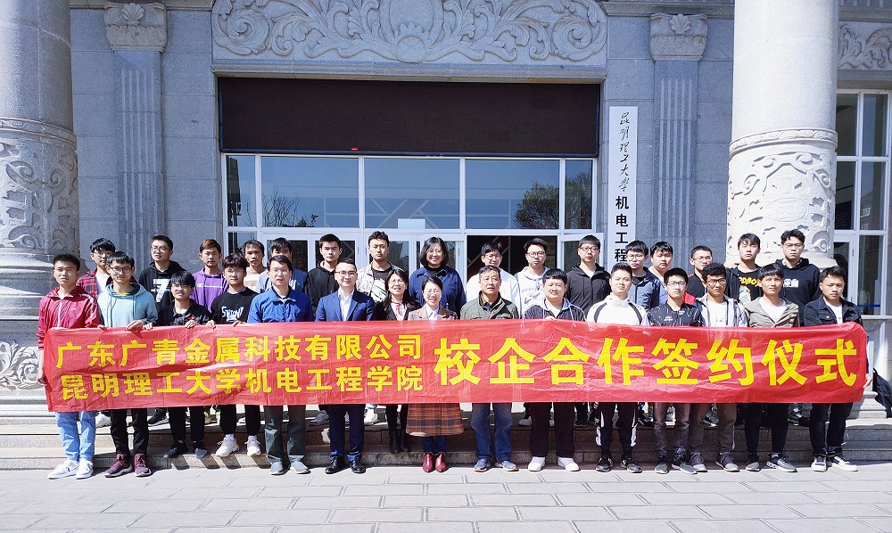3月11日,广东广青金属科技有限公司与昆明理工大学机电工程学院在学校机电楼举行了校企合作签约及授牌仪式。昆明理工大学机电工程学院党委书记李金涛、广青科技人力资源科科长张艺玲及学生代表共20余人参加了签约仪式。