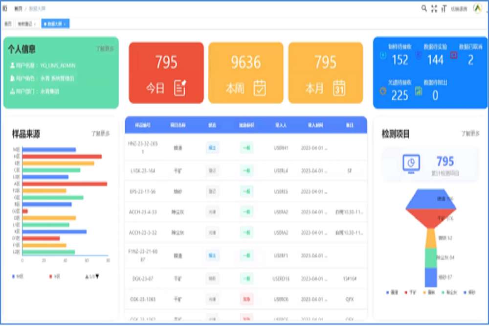 在数据可视化方面,LIMS系统的大屏显示功能为用户带来了更直观的体验。用户可以轻松查看来样部门、实验项目以及当日、本周和本月的样品数据,从而更好地掌握实验进度和数据变化,为用户提供了一个集中的信息源,有助于他们更好地协调和管理各项工作任务。